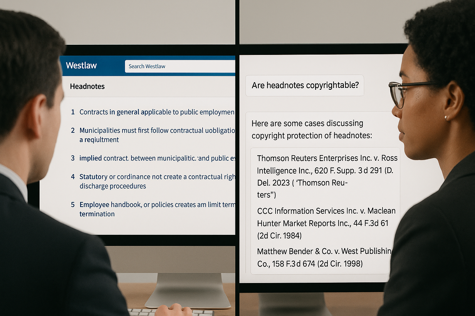 Two attorneys, one using Westlaw and Headnotes, the other prompting an AI legal tool. Images are meant to be broadly illustrative and are not intended to be accurate in every detail.