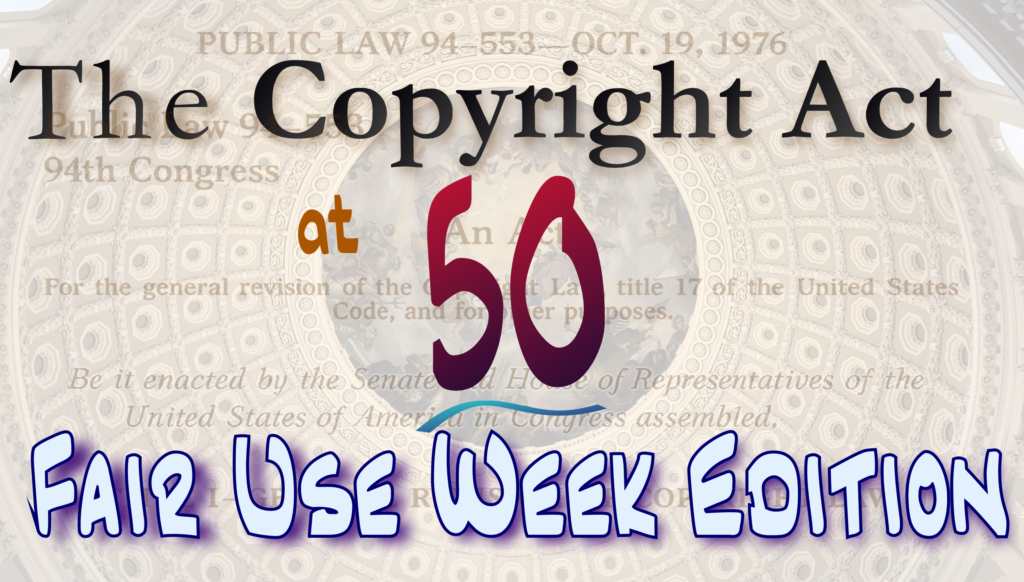 Every year around this time, Civil Society copyright advocates set aside a week to celebrate one of the most important parts of our copyright law. The brainchild of the incomparable Kyle K. Courtney, Fair Use Week is now in its thirteenth year. What started out as a celebration within the Harvard University community has now grown into an international celebration. So as a part of the Fair Use week celebrations, we are extending our series on the 50th Anniversary of the Copyright Act of 1976 to include a week of posts on Section 107 of Title 17, our fair use statute.