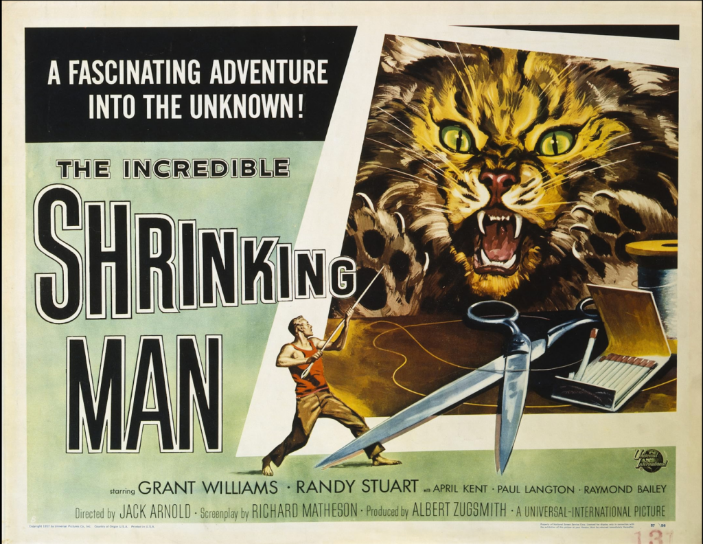 For anyone who has seen The Incredible Shrinking Man or read the Richard Matheson novel on which it is based, you know the ending is the saddest part. The short version for anyone who hasn’t read it (not sure if I need a spoiler warning on a 67-year-old book): A man named Scott Carey is on vacation when he is exposed to a radioactive cloud. Six months later, he notices his clothes are too big. As time progresses, Carey becomes a national sensation, but no one can do anything about his shrinking. Eventually, he finds himself alone in his basement, pondering the nature of his very existence. Carey makes peace with his fate by embracing a kind of cosmic consolation: matter cannot be destroyed, and so he must persist, even as he shrinks toward the subatomic. He will become part of the universe. He takes comfort in the idea that no matter how small he becomes, he will still, in some meaningful sense, exist.