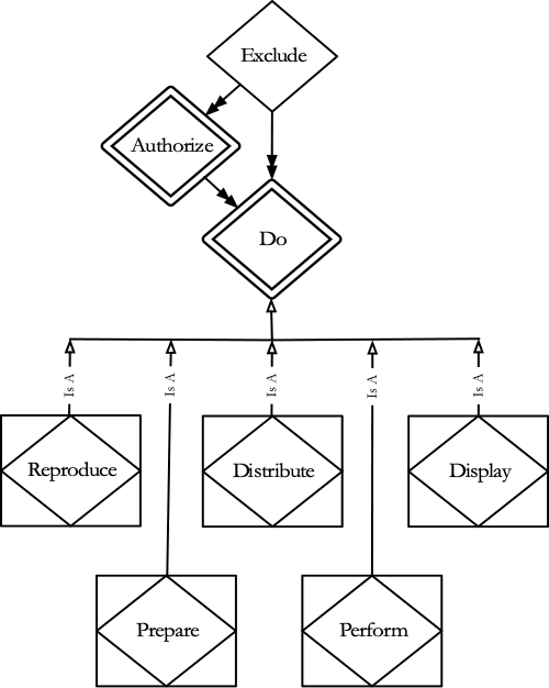You can’t authorize an entity; you can only authorize a further action, so “authorize” is weak. The five exclusive rights are associative entities, in part because of their relationship with the “do” relationship. The five are connected to “do” through an “Is-A” relationship—each is an example of something one can do with a work. Performing “is a” thing you can do; distribution “is a” thing you can do; and so forth.