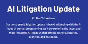 This is the second of five webinars in our Fall Discussion Series in collaboration with OCEAN. Join us for a discussion of the impacts of the ever-changing AI legal landscape on the work of researchers and the institutions that support them. Rachael Samberg will walk us through how the latest litigation affects research activities, such as text data mining, how researchers can utilize fair use to address these issues, and other considerations, such as research integrity and liability, and privacy considerations.
